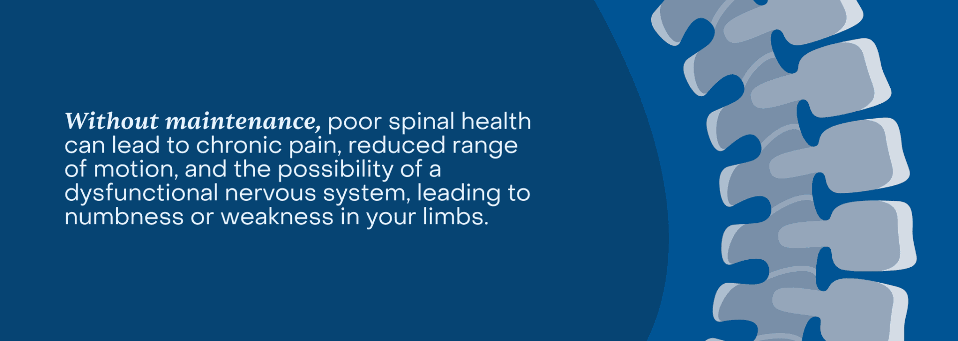 Proper spinal health influences posture, mobility, and flexibility, impacting balance, coordination, and endurance. Without maintenance, poor spinal health can lead to chronic pain, reduced range of motion, and the possibility of a dysfunctional nervous system, leading to numbness or weakness in your limbs.