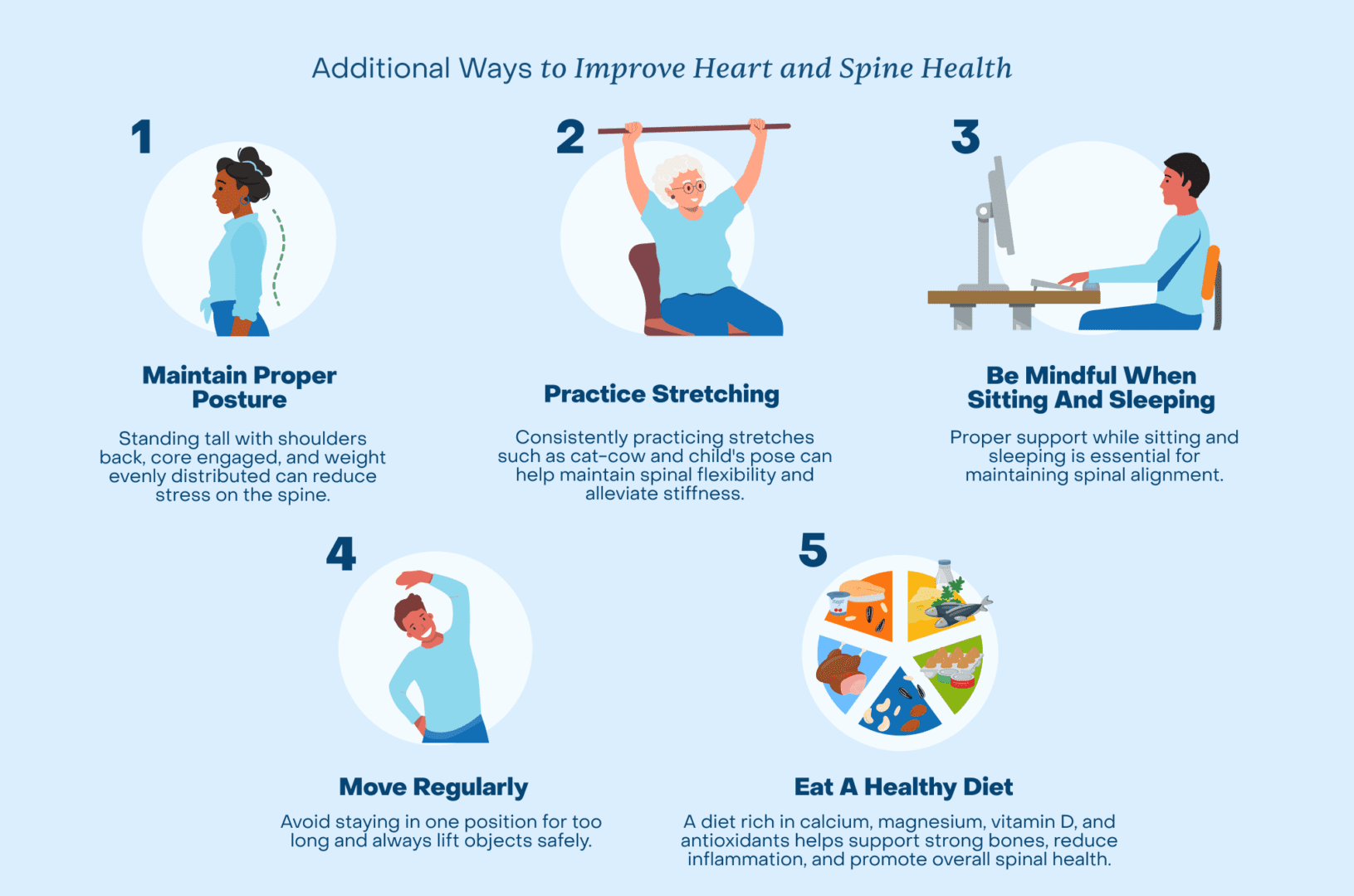 To limit issues, regular exercise and proper nutrition play a role in maintaining a healthy spine by reducing inflammation, strengthening core muscles, and promoting bone density. Proper ergonomics, daily stretching, and a healthy weight can further help prevent debilitating damage. By prioritizing both spinal and heart health, individuals can improve their overall well-being, boost energy levels, and maintain an active lifestyle well into the future.