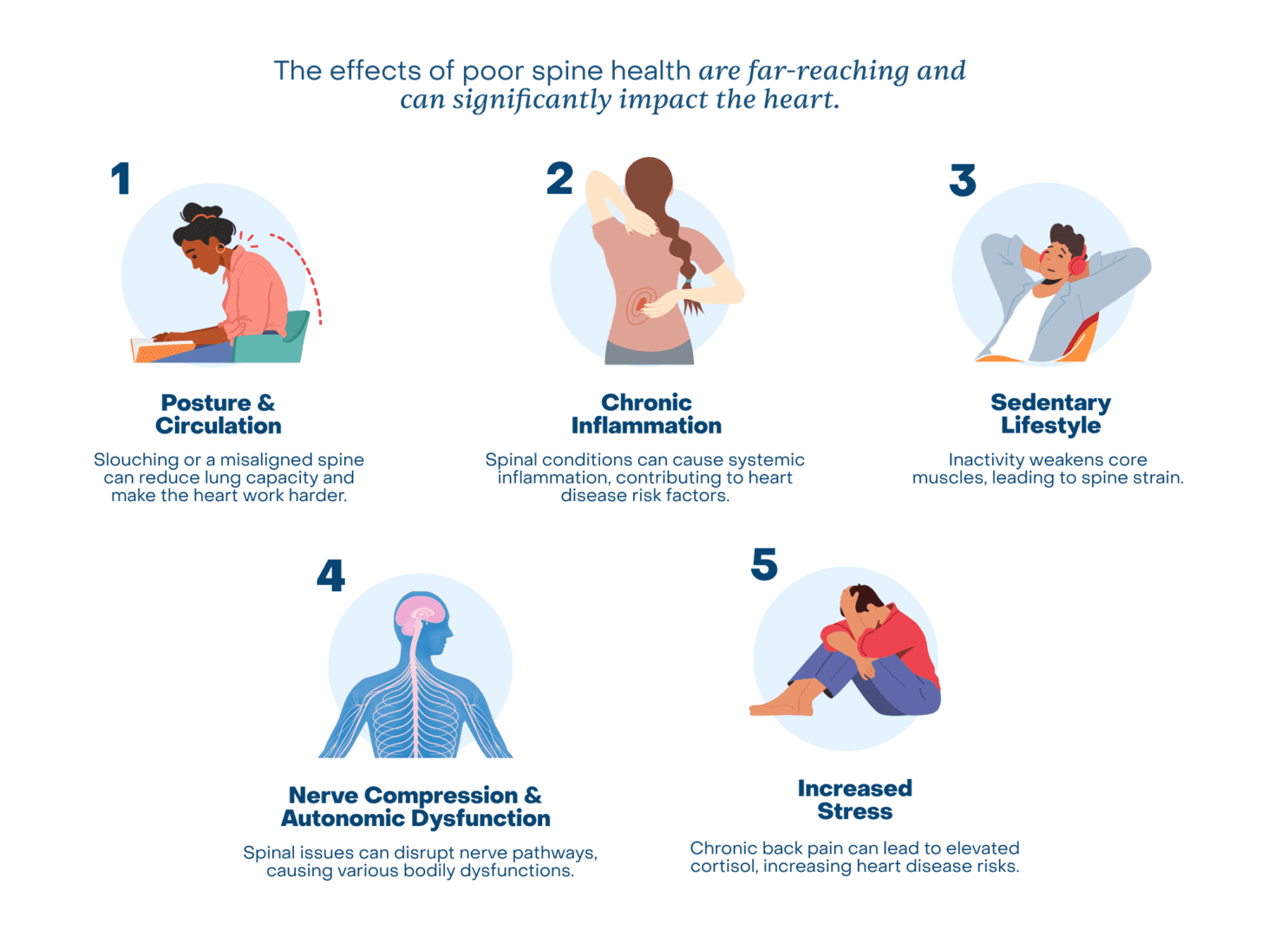 The effects of poor spine health are far-reaching and can significantly impact the heart. Key issues include: