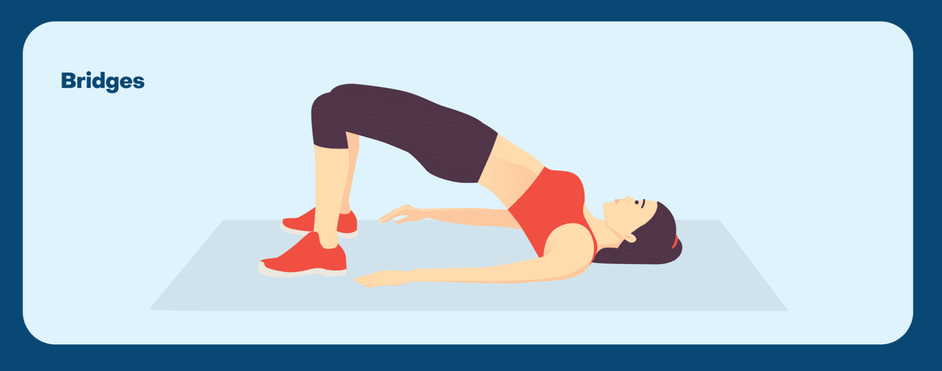Bridges help strengthen the core, lower back, and glutes while enhancing blood flow and reducing spinal stiffness. Begin by lying on your back with your knees bent and feet flat on the floor, hip-width apart. Press your feet into the ground and slowly lift your hips toward the ceiling, engaging your glutes and core. Hold for a few seconds at the top before lowering your hips back to the ground in a controlled motion. Repeat for 10-12 repetitions.