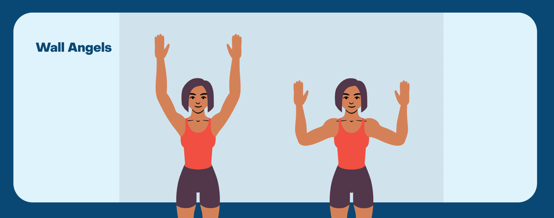 This exercise corrects posture, expands lung capacity, and strengthens the upper back muscles to support spinal alignment. Stand with your back against a wall, keeping your feet a few inches away and your lower back gently pressed against the surface. Raise your arms to a 90-degree angle, forming a goalpost shape with your elbows bent. Slowly move your arms up and down, as if making a snow angel, while keeping them in contact with the wall as much as possible. Perform 8-10 repetitions with controlled movement.