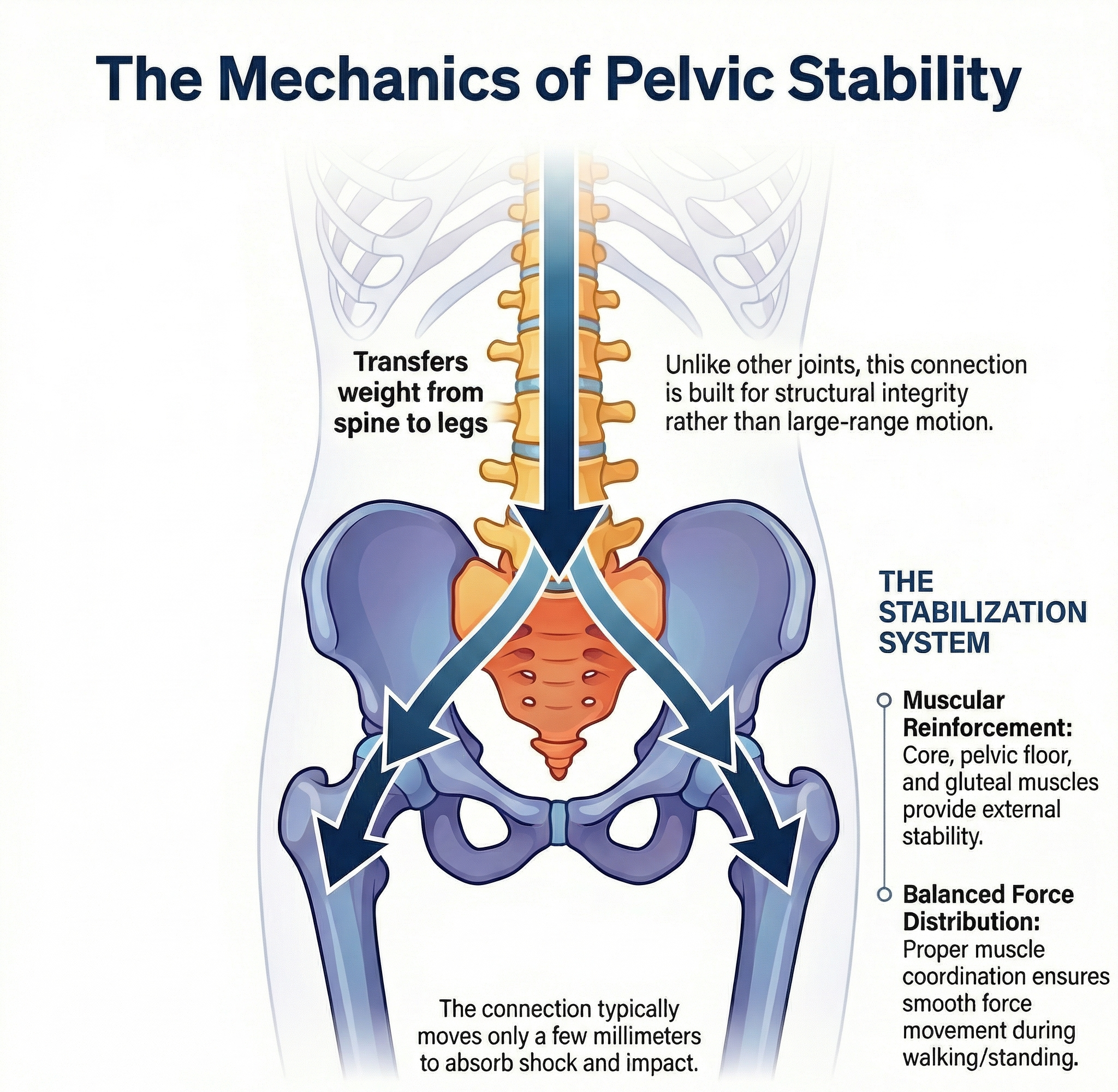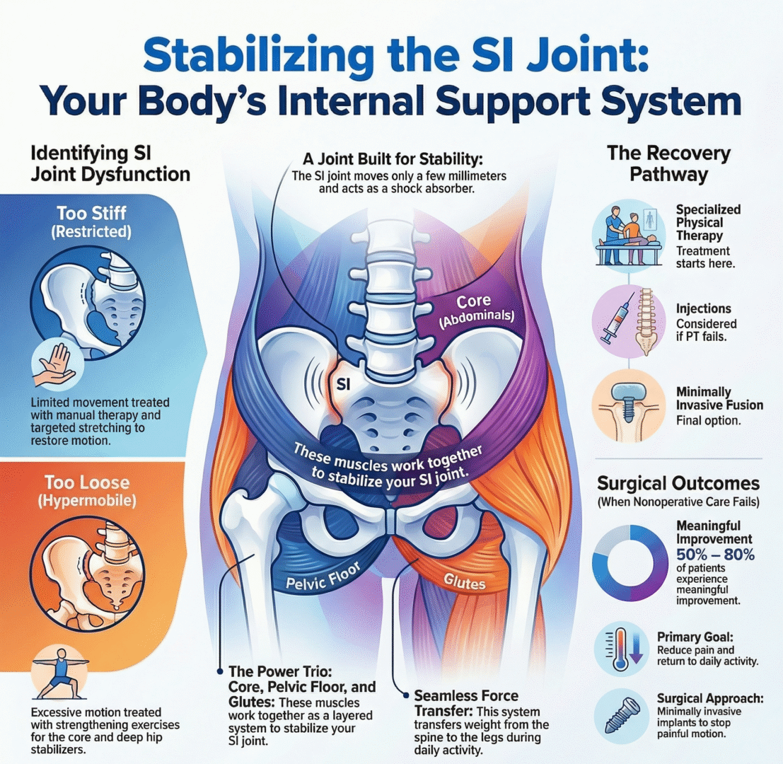 The SI joint depends heavily on support from the core, hips, and pelvic floor, which is why strengthening and coordination are key to recovery.