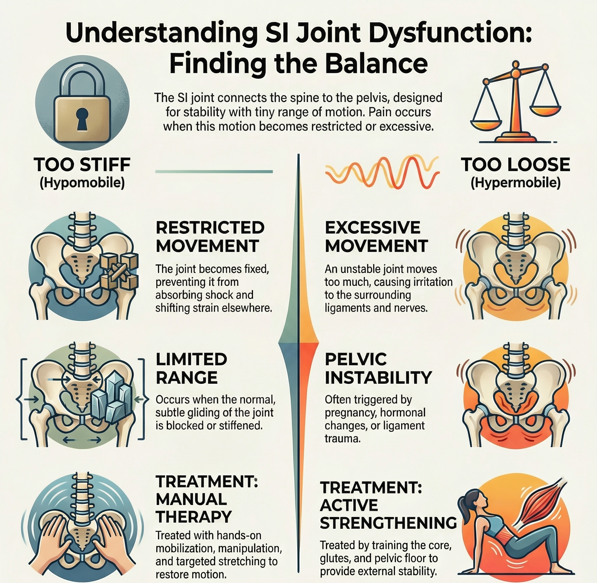 SI joint dysfunction usually develops when the balance between stability and movement is disrupted.